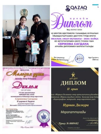 1. Ү Республикалық «Жарық Жұлдыз» атты балалар өнер байқауында «Хореография» жанры ІІ орын - Нурман Дильнура 2. Ү Республикалық «Жарық