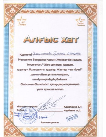 1. Республикалық көлем бойынша дарынды және таланттыларға арналған «Қыс қызығы -2021 » атты байқауында І орын- Бейсенғазы Әмина 2. Жас