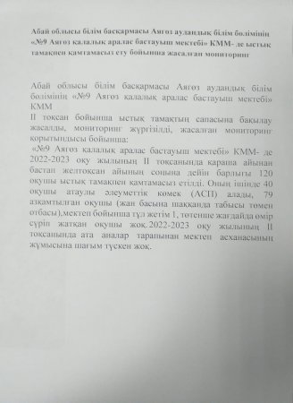 Абай облысы білім басқармасының Аягөз ауданы білім бөлімінің «№9 Аягөз қалалық аралас бастауыш мектебі» КММ-не уақытша декреттік бос