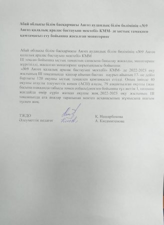 Абай облысы білім басқармасының Аягөз ауданы білім бөлімінің «№9 Аягөз қалалық аралас бастауыш мектебі» КММ-де тегін ыстық тамақпен қамтамасыз ету бойынша 3 тоқсанға мониторинг