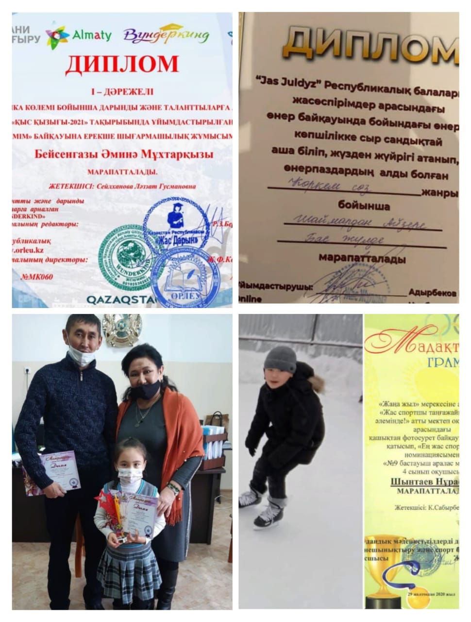 4. Қазақстан Республикасының «BILIMBULAQ.KZ» қосымша білім бері және дамыту порталының үйымдастырған «Мәнерлеп оқу» атты республикалық байқауында І? І жүлделі орындарғы ие болған - Ерболқызы Гүлдана