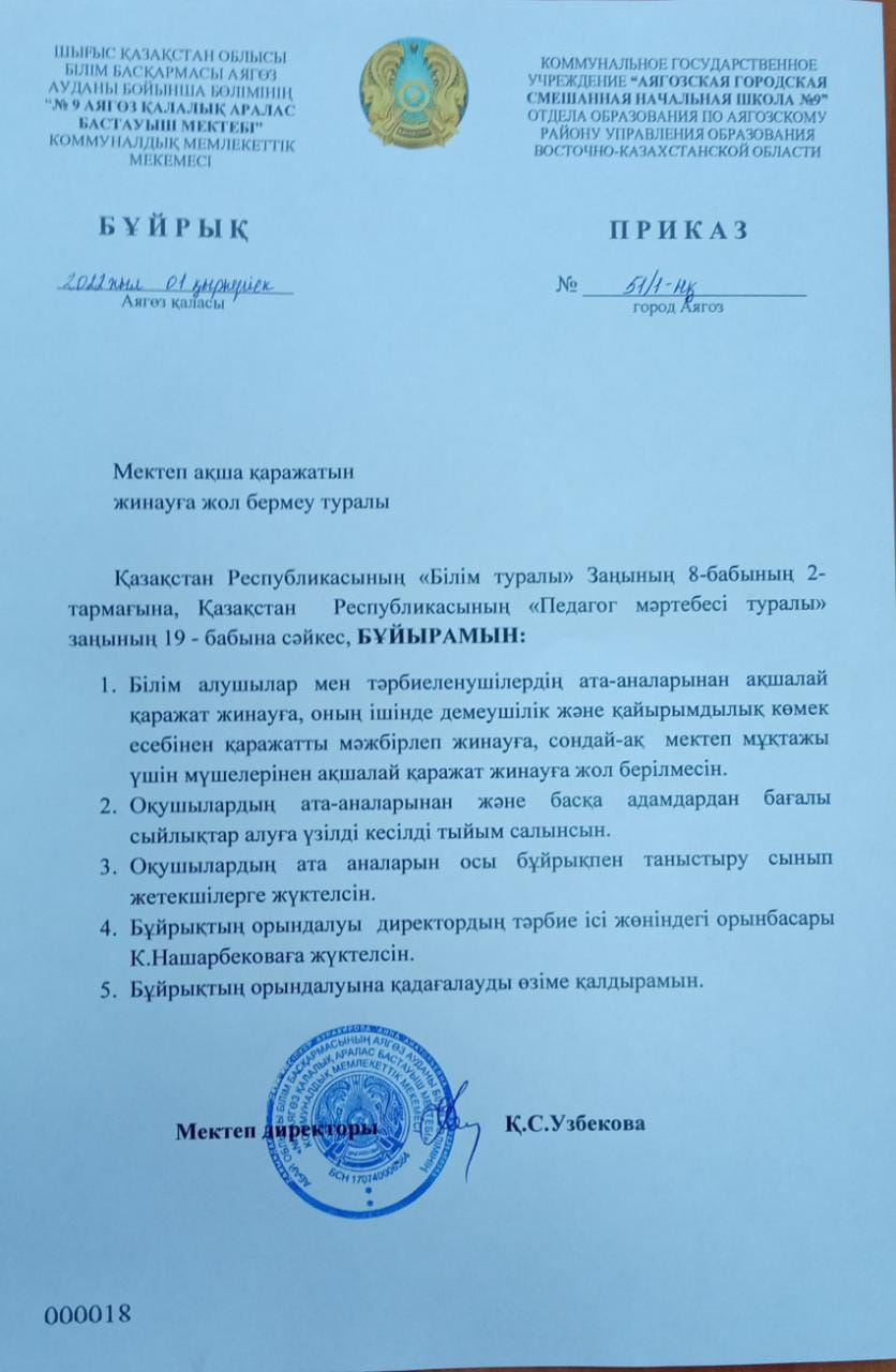 Абай облысы білім басқармасының Аягөз ауданы білім бөлімінің «№9 Аягөз қалалық аралас бастауыш мектебі» КММ-нің ақша қаражатын жинауға жол жермеу туралы бұйрық