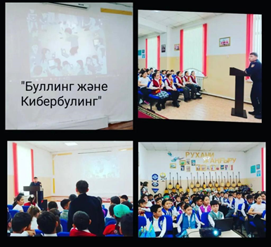 3-4 сынып оқушылары арасында мектеп директорының тәрбие ісі жөніндегі орынбасары, мектеп психологтары және мектеп инспекторымен бірлескен «Буллинг және кибербуллинг» тақырыбында жиналыс өткізді. Мақсаты: «Буллинг» сөзінің мағынасын ашу, таныту; Оқушылар арасындағы қорлау, мазақтау, намысқа тию жағдайларын алдын алу; Сынып ұжымын сыйластыққа, бір-біріне қолдау көрсете білуге тәрбиелеу.