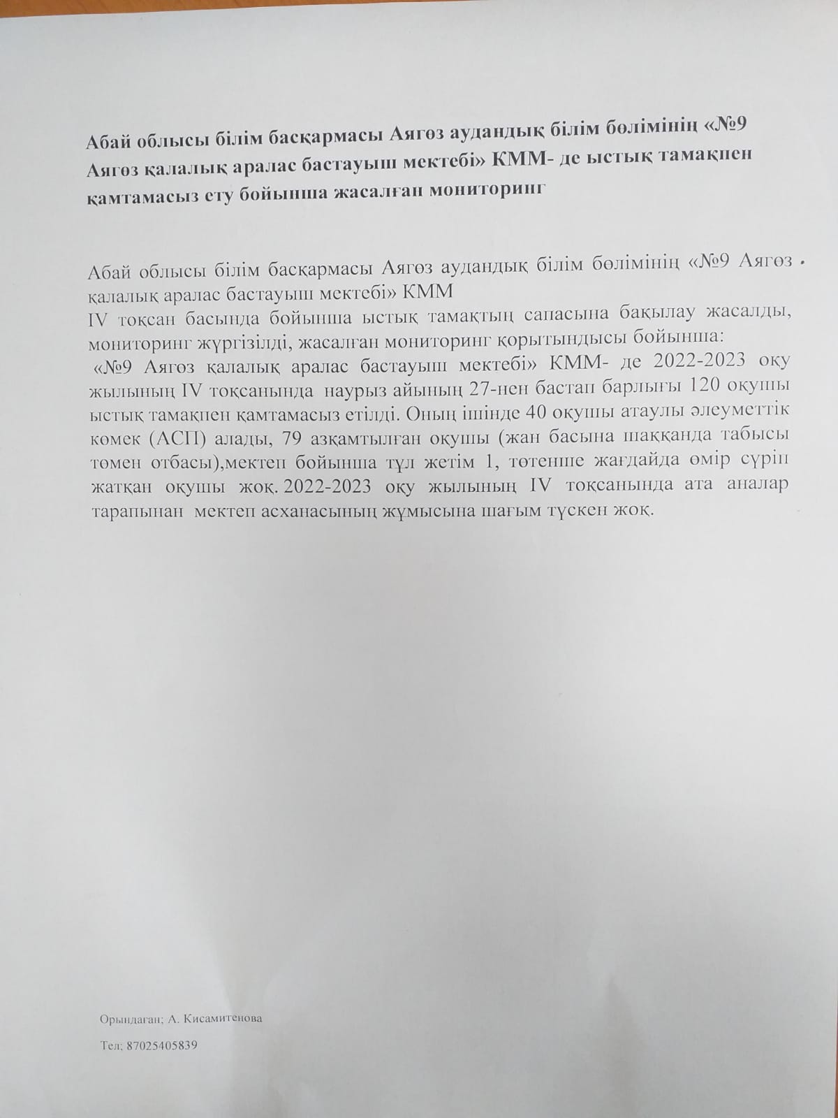 2022-2023 оқу жылында "№9 Аягөз қалалық бастауыш аралас мектебі" КММ-де ыстық тамақпен қамтамасыз ету бойынша IV тоқсан басында мониторинг жүргізілген
