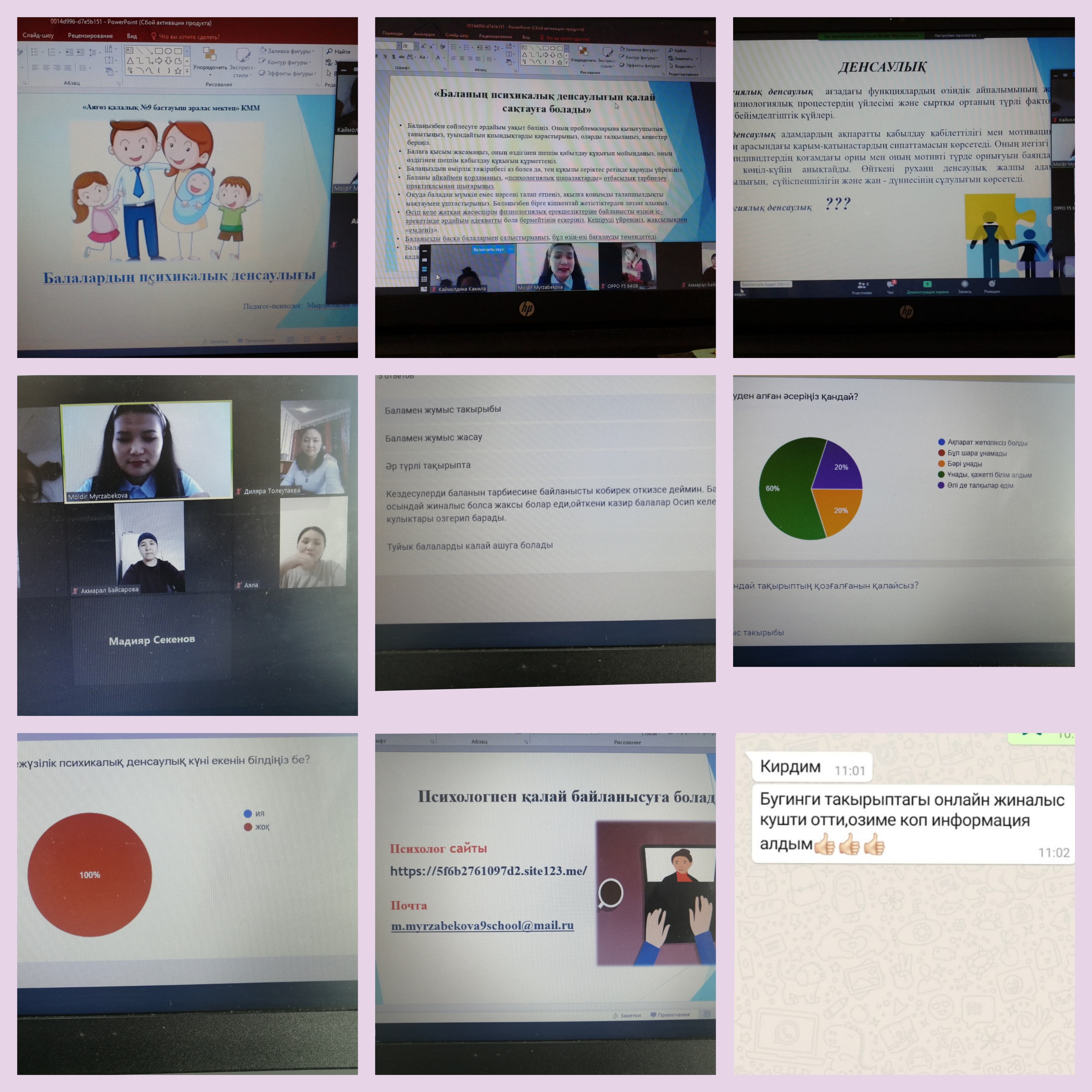 10 қазан - Дүниежүзілік психикалық денсаулық күніне орай 10.10.2020 жылы "Балалардың психикалық денсаулығы" тақырыбында 4 класс оқушыларының ата-аналарымен мектеп психологы ZOOM платформасы арқылы онлайн кездесу өткізді.