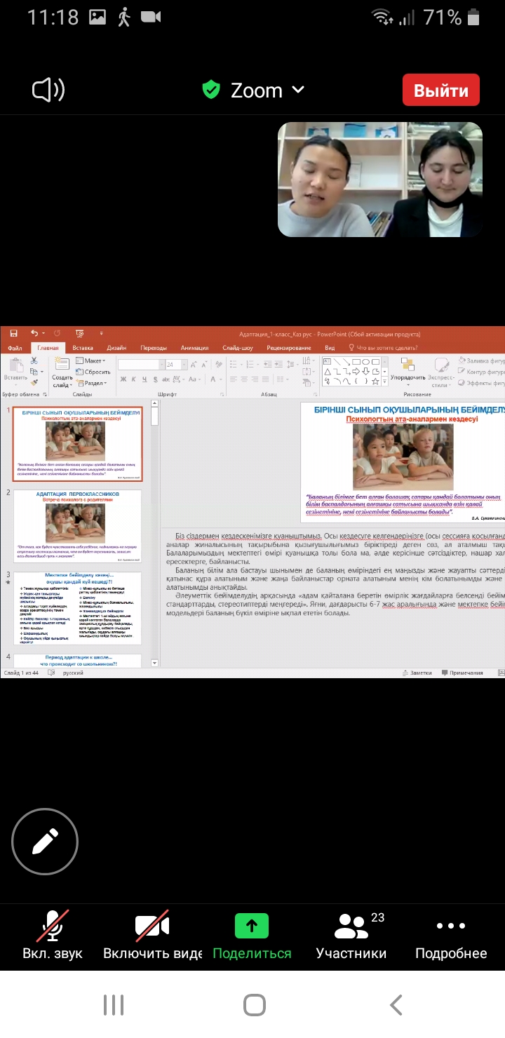 27.11.2021 ж. мектептің педагог - психологтары Мырзабекова М.Ж және Панченко И. В осы тақырып бойынша ата-аналар жиналысын өткізді. 1-сыныптың ата-аналары қатысты. Олар оқушылардың бірінші оқу жылындағы қиындықтарымен танысты. Ата-аналарға осы кезеңде балалармен өзара әрекеттесуді қалай дұрыс ұйымдастыруға болатындығы туралы ұсыныстар ( кеңестер) берілді.