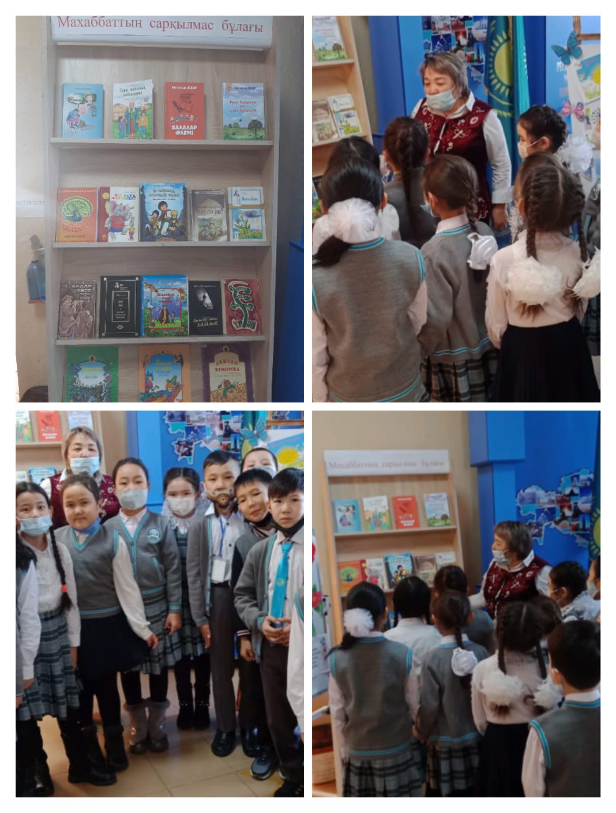 « Өзің - өзі тану : Махаббат пен Шығармашылық педагогикасы » атты онкүндіктің аясында Шығыс Казақстан облысы білім басқармасы Аягөз ауданы бойынша білім бөлімінің « 9 Аягөз калалық аралас бастауыш мектебі» КММ – де апталық іс шарасында кітапханашы Бейсекенова З.Ж. ұйымдастыруымен кітапханалық сабағы мен «Махаббаттың сарқылмас бұлағы» -өтті. Көрменің мақсаты : Оқушыларға адамгершілік-рухани тәрбие беру, өзара қарым-қатынастағы сыйластықты ұғындыру, сүйіспеншілік қасиеттері туралы түсінік беру. Бір-біріне деген сыйластық сезімін құрметтеуге шақыру. Кітапты насихаттау. Балаларға адамгершілікке, мейірімділікке, сүйіспеншілікке бейбітшілік пен достыкқа кітап арқылы түсініктер берілді.