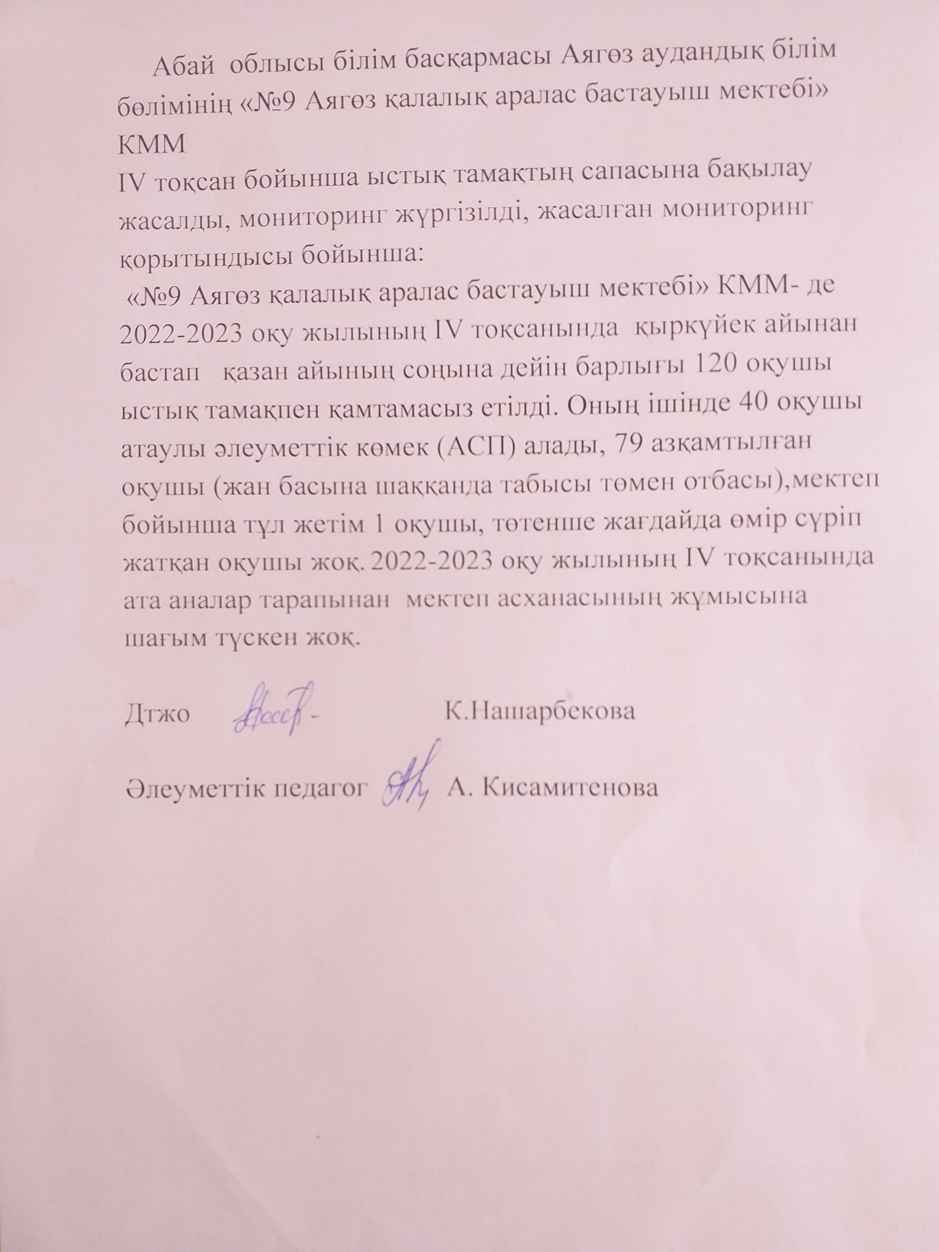 Аягөз ауданы білім бөлімінің "#9 бастауыш аралас мектебі" КММ-де Ыстық тамақпен қамтамасыз ету бойынша жүргізілген мониторинг