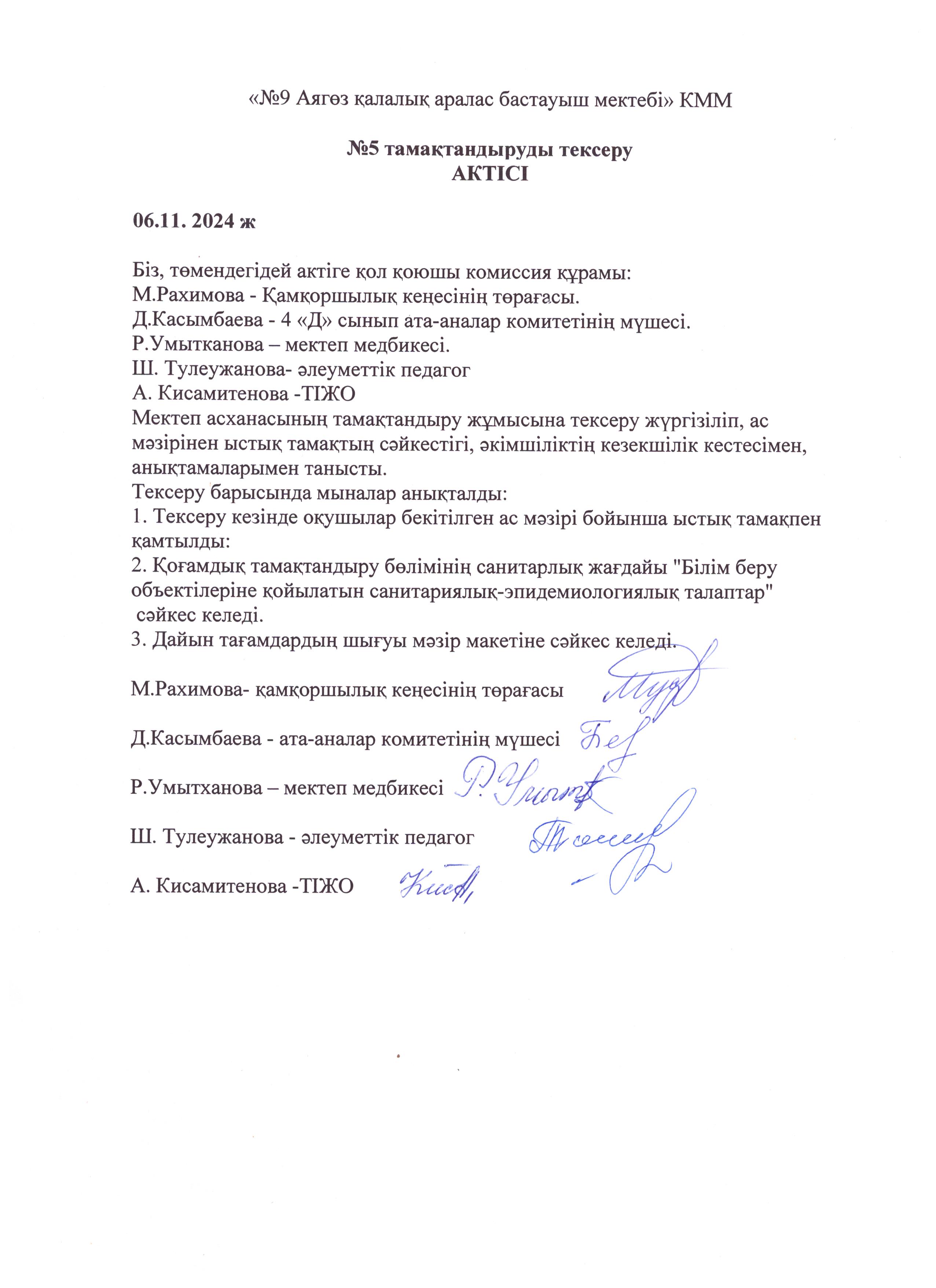 Мектеп сайты » Питание » "№9 Аягөз қалалық аралас бастауыш мектебі" КММ де ыстық тамақпен қамту бойынша тамақтандыруды кезекті тексеріс болды. Бракераж комиссиясының тексеру актісі жасалды.