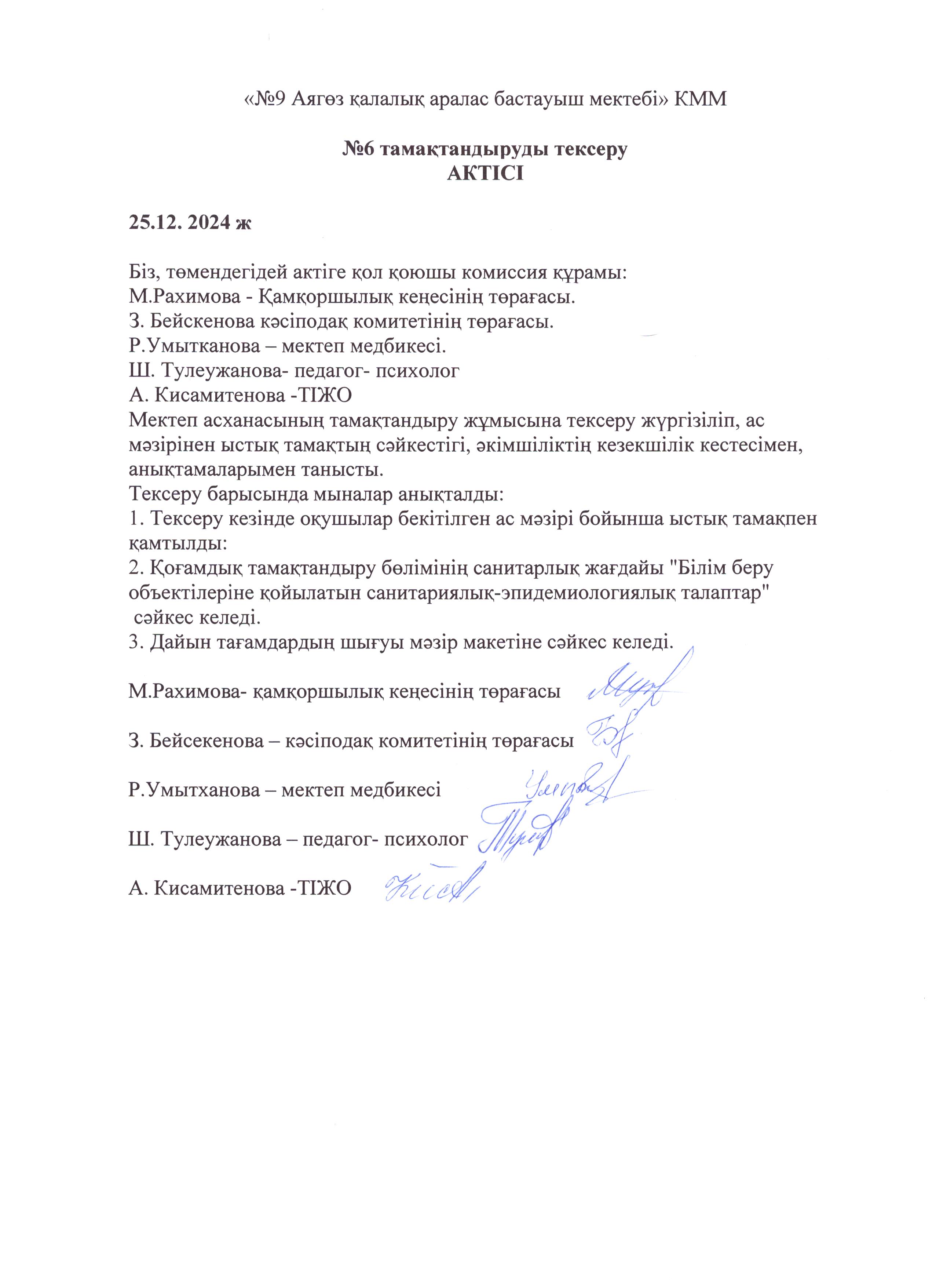 "№9 Аягөз қалалық аралас бастауыш мектебі" КММ бойынша ыстық тамақпен қамту сапасы тексеріліп отыр.