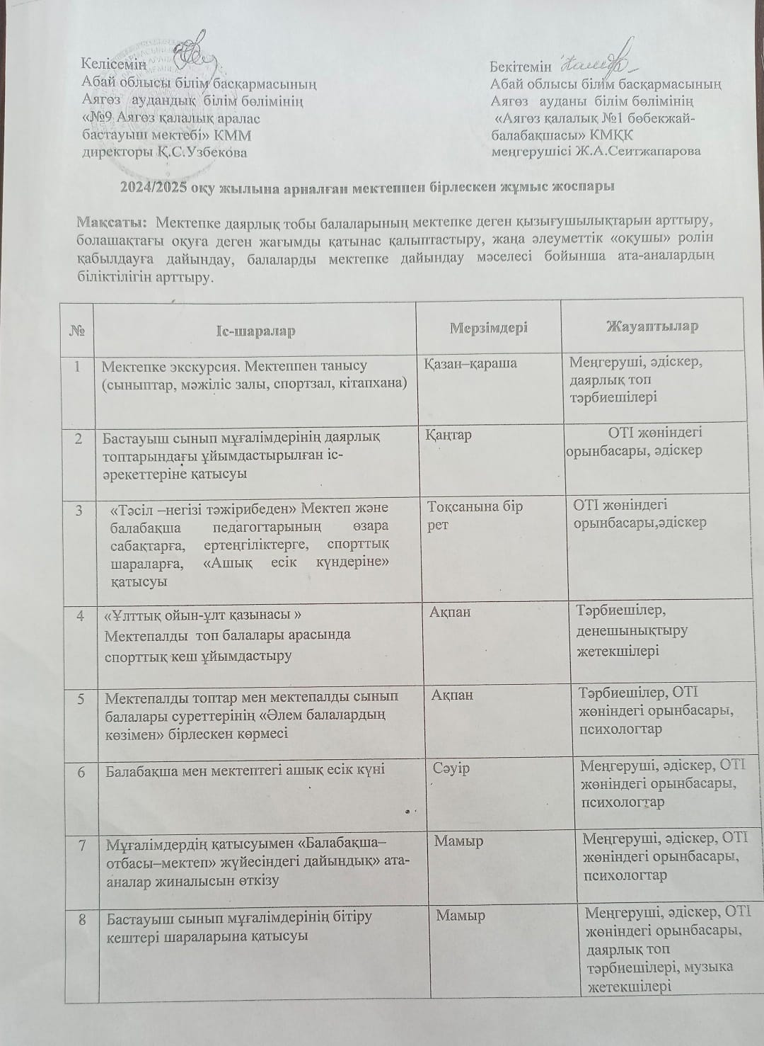 Абай облысы білім басқармасының Аягөз ауданы білім бөлімінің «№9 Аягөз қалалық аралас бастауыш мектебі»КММ мен "Аягөз қалалық № 1 бөбекжай- балабақшасы"КМҚК 2024-2025 оқу жылына арналған бірлескен жұмыс жоспары "