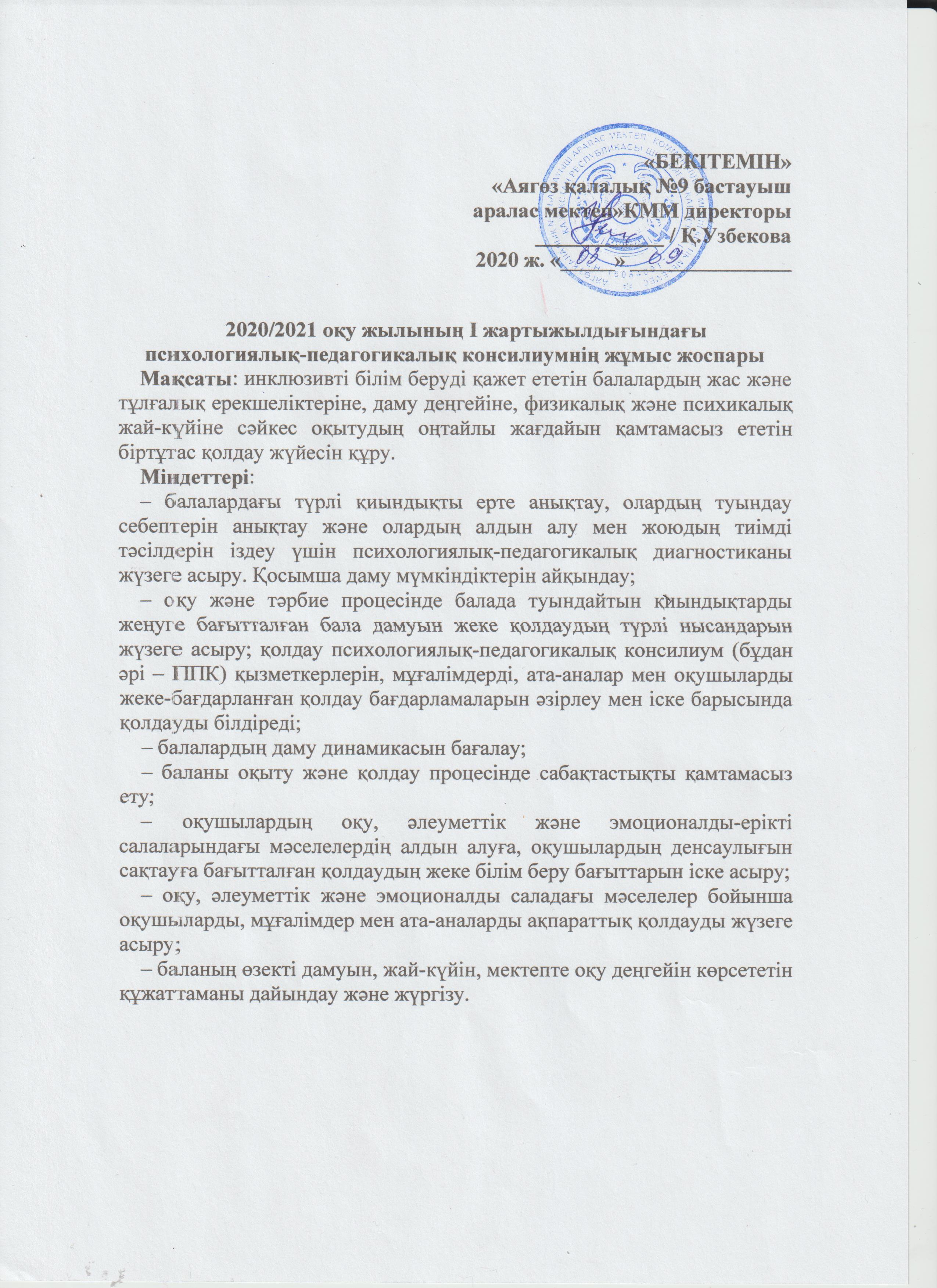 » 2020-2021 оқу жылының І жартыжылдығындағы психологиялық-педагогикалық консилиумнің жұмыс жоспары